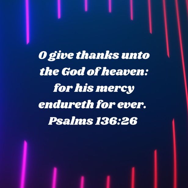 Uncategorized Date: November 9, 2018Author: theuchegod 0 Comments O give thanks unto the God of heaven: for his mercy endureth for ever. Psalms 136:26 KJV Share this: Click to share on X (Opens in new window) X Click to share on Pinterest (Opens in new window) Pinterest Click to share on Facebook (Opens in new window) Facebook Click to share on Threads (Opens in new window) Threads Like Loading... Related
