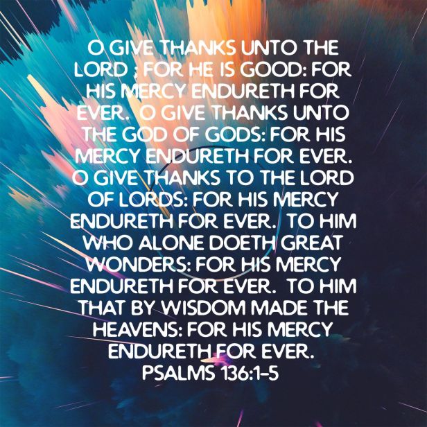 O give thanks unto the Lord ; for he is good: for his mercy endureth for ever. O give thanks unto the God of gods: for his mercy endureth for ever. O give thanks to the Lord of Lords: for his mercy endureth for ever. To him who alone doeth great wonders: for his mercy endureth for ever. To him that by wisdom made the heavens: for his mercy endureth for ever.