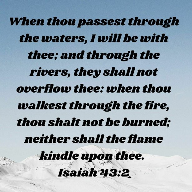 He said in Isaiah 43:2. “When thou passest through the waters, I will be with thee; and through the rivers, they shall not overflow thee: when thou walkest through the fire, thou shalt not be burned; neither shall the flame kindle upon thee”.